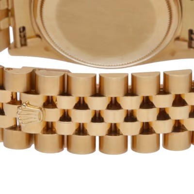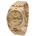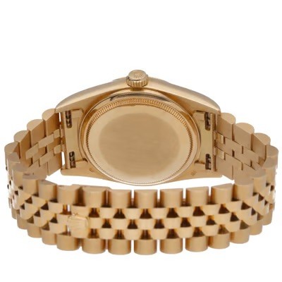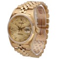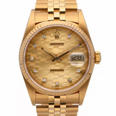 manufactured in 1986. This classic timepiece features a 36mm 18ct yellow gold Oyster case with a diamond-set bezel, adding a touch of luxury. The captivating gold dial presents a unique honeycomb or linen pattern, further adorned with applied diamond hour markers, and a date aperture at 3 o'clock with the signature Cyclops lens. Powered by a self-winding automatic movement, officially certified as a chronometer. Fitted to an 18ct yellow gold Jubilee bracelet.