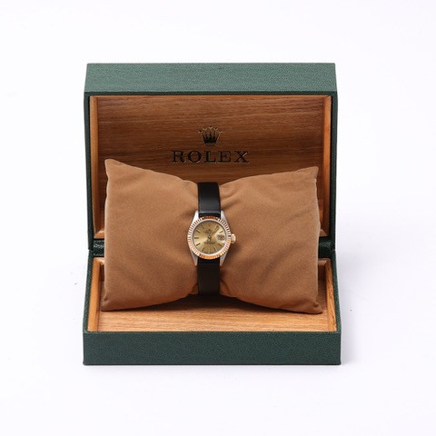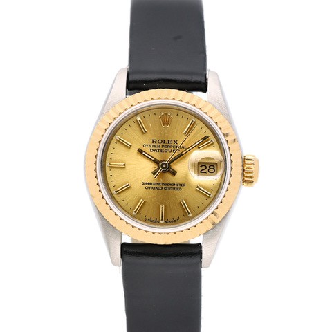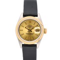 manufactured in 1988. This elegant timepiece features a 26mm bi-metal Oyster case, combining stainless steel with an 18ct yellow gold fluted bezel. The gold dial presents with applied baton hour markers, luminous accents, and a date aperture at 3 o'clock with the signature Cyclops lens. Powered by a self-winding automatic movement, officially certified as a chronometer. Presented on a black leather strap.