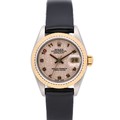 manufactured in 1996. This elegant timepiece features a 26mm bi-metal Oyster case, combining stainless steel with an 18ct yellow gold fluted bezel. The unique dial is a muted rose or champagne tone with a granular or 'linen' texture, adorned with diamond-set dot hour markers and Roman numerals. It also features a date aperture at 3 o'clock with the signature Cyclops lens. Powered by a self-winding automatic movement, officially certified as a chronometer. Presented on a black leather strap.