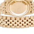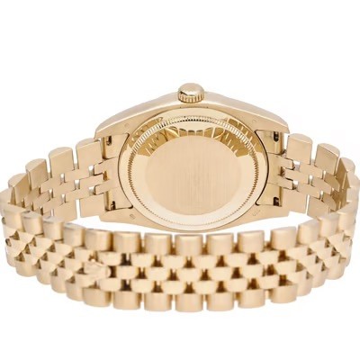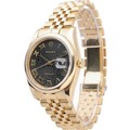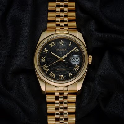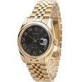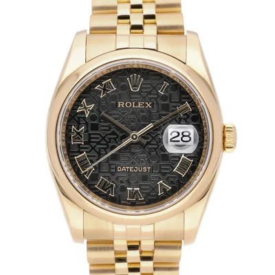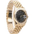 manufactured in 2004. This luxurious timepiece features a 36mm 18ct yellow gold Oyster case with a smooth polished bezel. The unique black dial is adorned with applied Roman numerals (VI and IX) and an overall textured, possibly "tapestry" or "concentric circle" pattern, adding depth and visual interest. It also features a date aperture at 3 o'clock with the signature Cyclops lens. Powered by a self-winding automatic movement, officially certified as a chronometer. Fitted to an 18ct yellow gold Jubilee bracelet.