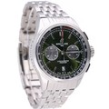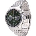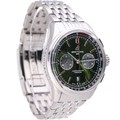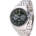 manufactured in 2021. This automatic chronometer-certified timepiece features a 42mm polished stainless steel case with a distinctive green dial. The dial is accented with contrasting silver-tone chronograph subdials (30-minute and 12-hour registers), a small seconds subdial, and a date aperture at 6 o'clock. It boasts a black inner bezel with a white tachymeter scale and red 'TACHYMETER' inscription, and is fitted on a matching stainless steel bracelet.