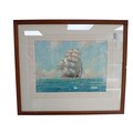 The artist's keen eye for nautical detail is evident in the precise rendering of the rigging and canvas, as the celebrated vessel cuts through a vibrant blue sea.