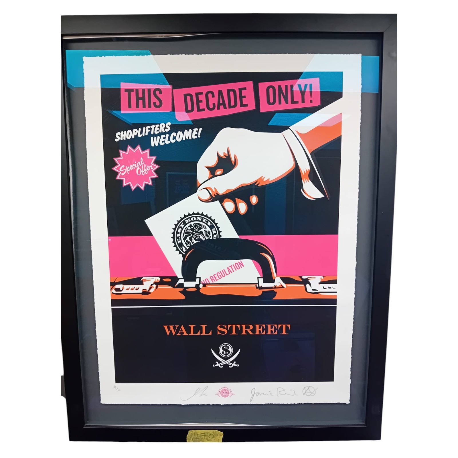 A powerful collaborative screenprint titled Shoplifters Welcome, created in 2012 by two giants of contemporary graphic art: Shepard Fairey and Jamie Reid.