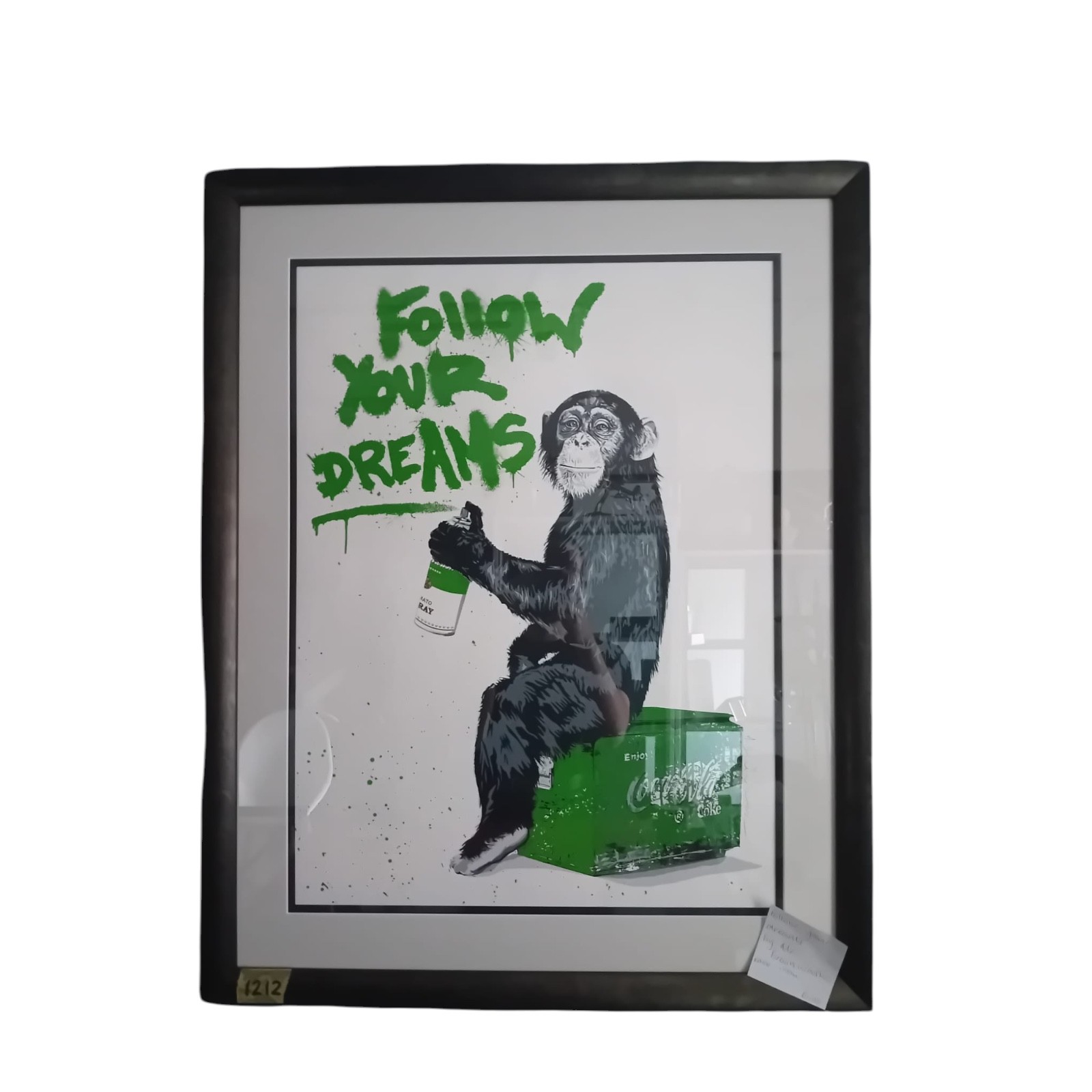 This vibrant work, titled "Everyday Life," depicts a contemplative chimpanzee seated on a Coca-Cola crate, holding a spray can, with the artist's signature phrase "FOLLOW YOUR DREAMS" emblazoned above in dripping green graffiti.