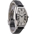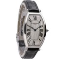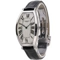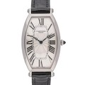 manufactured in 2003. This distinguished timepiece features a sophisticated 26mm tonneau-shaped platinum case, a highly desirable and luxurious material. The white dial is a masterpiece of design, with a central guilloché motif, oversized elongated Roman numerals radiating outwards, and classic blued-steel hands. The fluted crown is set with a cabochon sapphire. Powered by a refined manual wind movement, true to Cartier's heritage. Presented on a black leather strap.