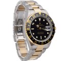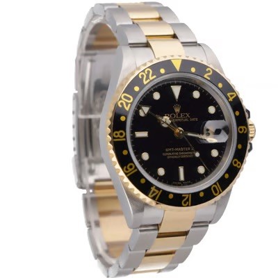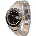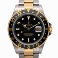 manufactured in 2004. This desirable bi-metal timepiece features a 40mm Oyster case, combining stainless steel with 18ct yellow gold. It is fitted with a unidirectional rotating bezel, famously known as the "Root Beer" bezel, with a black and gold insert providing a 24-hour display. The black dial presents with luminous dot and baton hour markers, gold Mercedes-style hands, a red GMT hand, and a date aperture at 3 o'clock with the signature Cyclops lens. Powered by a self-winding automatic movement, officially certified as a chronometer, allowing for independent setting of the GMT hand. Fitted to a bi-metal Oyster bracelet.