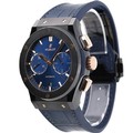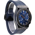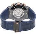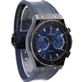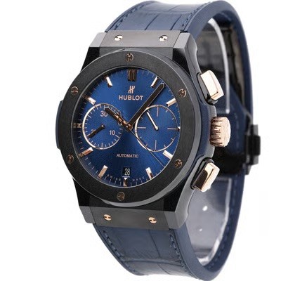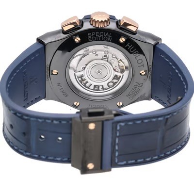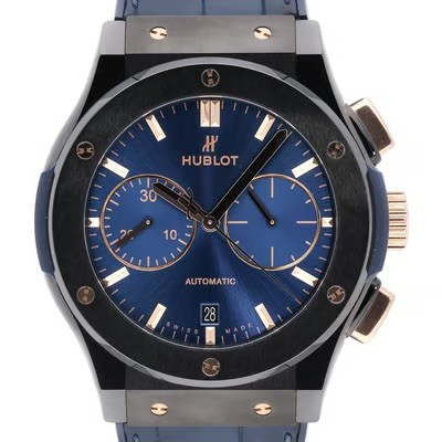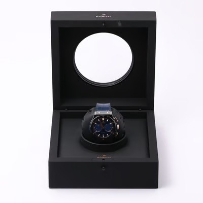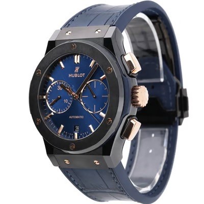 manufactured in 2022. This impressive timepiece features a 45mm polished and satin-finished blue ceramic case with a contrasting black ceramic bezel, secured by signature H-shaped titanium screws. The vibrant blue sunray dial showcases chronograph subdials at 3 and 9 o'clock, rose gold-tone applied indices, hands, and chronograph pushers, and a date aperture at 6 o'clock. Powered by a self-winding automatic chronograph movement. Presented on a blue rubber-backed leather strap.