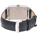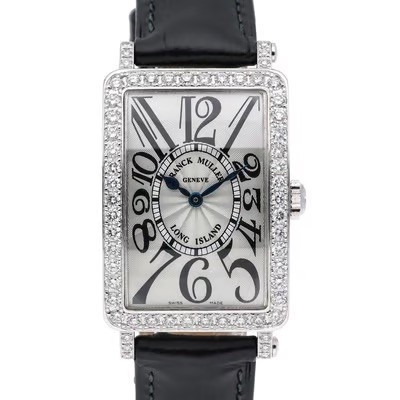 manufactured in 2004. This elegant timepiece features an 18ct white gold rectangular case, pavé-set with sparkling diamonds along the bezel. The silver dial is characteristic of the Long Island collection, with oversized exploding Arabic numerals, a sunburst guilloché central motif, and blued steel hands. Powered by a reliable quartz movement. Presented on a black leather strap.
