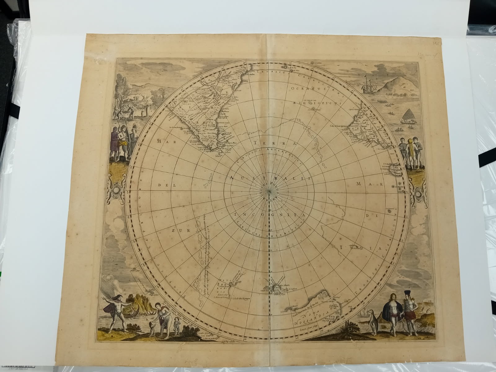 Frederick de Wit's Nova Orbis Tabula is celebrated for its elaborate allegorical vignettes in the corners, depicting the four seasons, elements, and signs of the zodiac, alongside smaller polar projections.